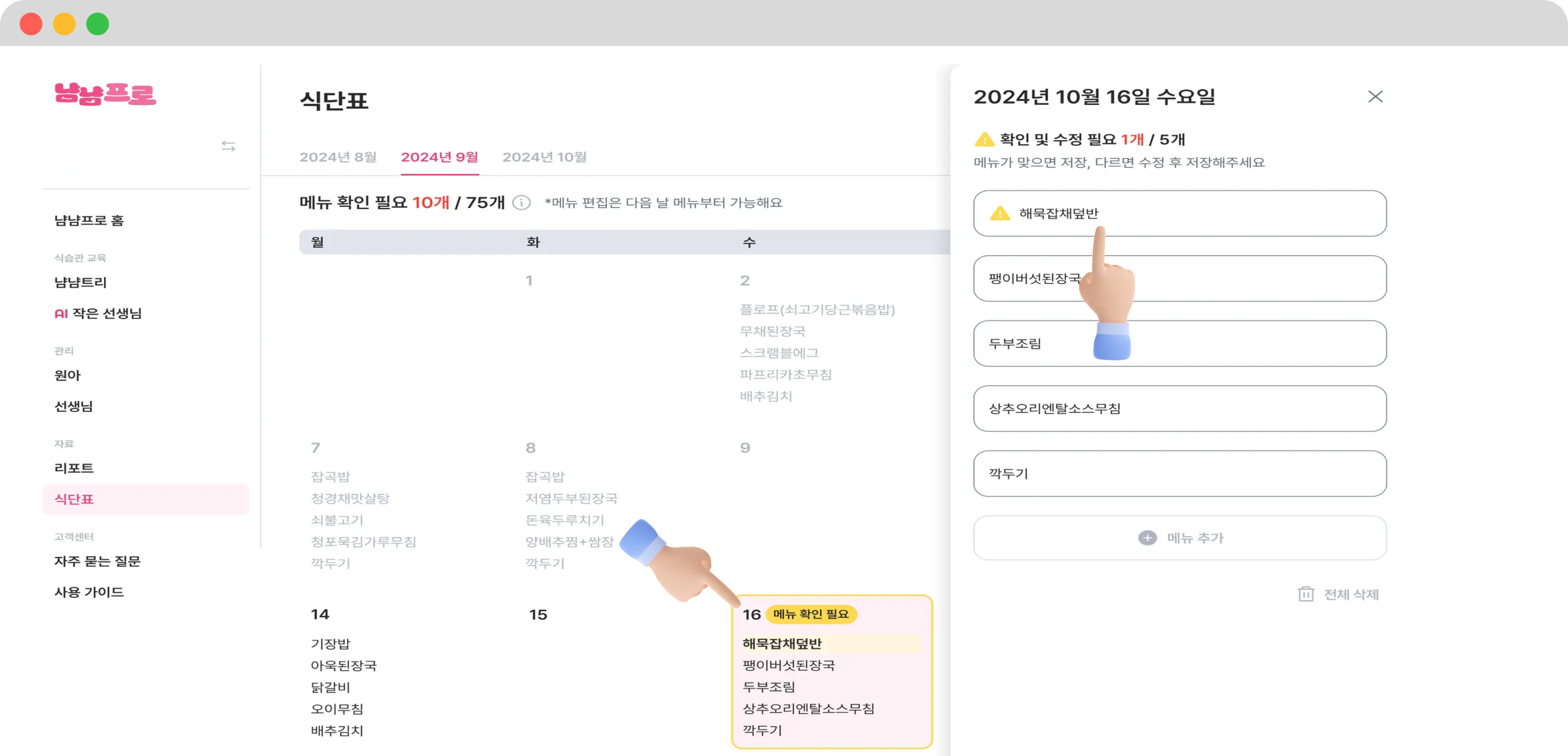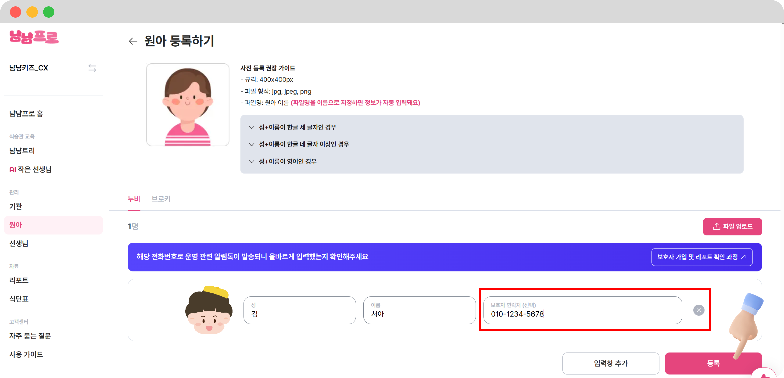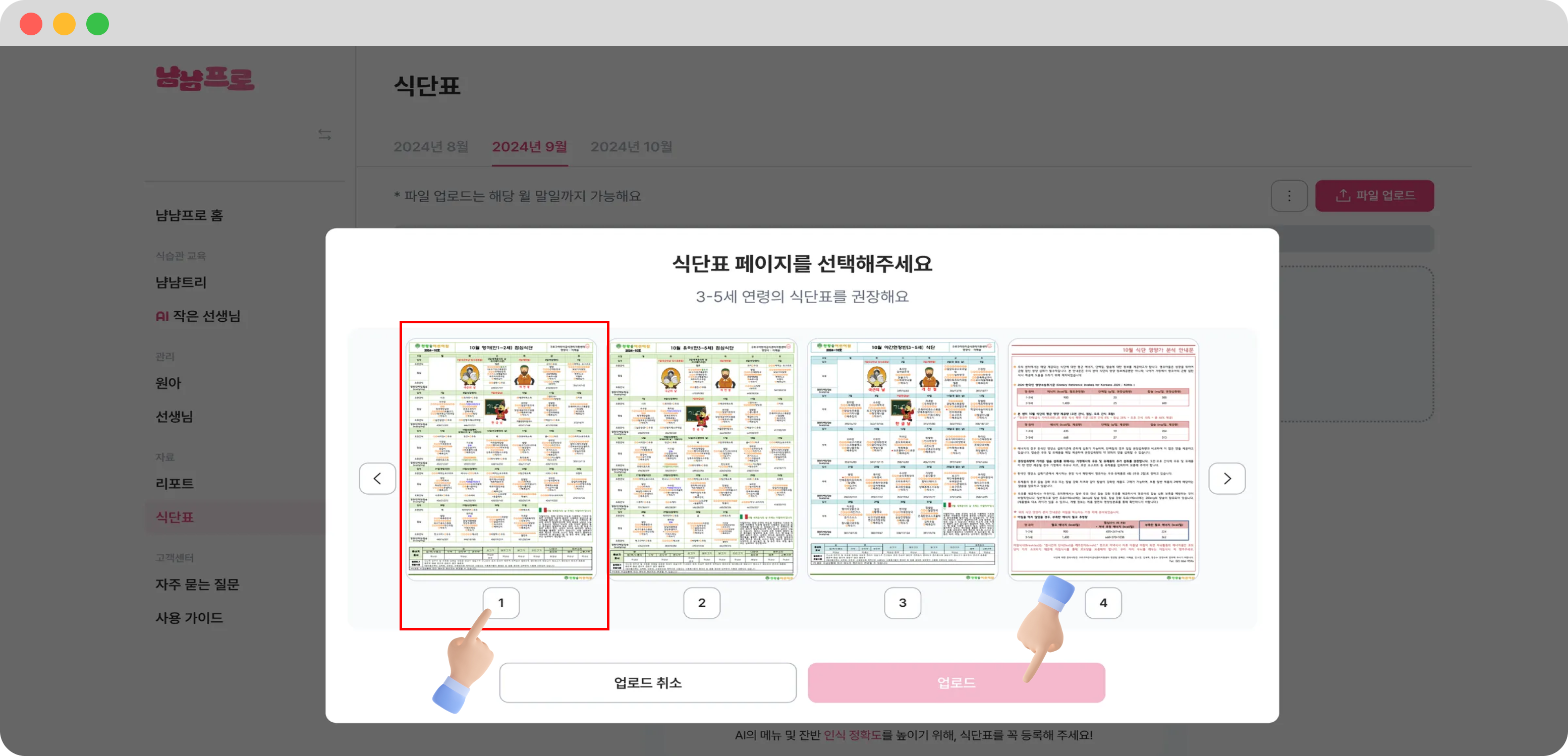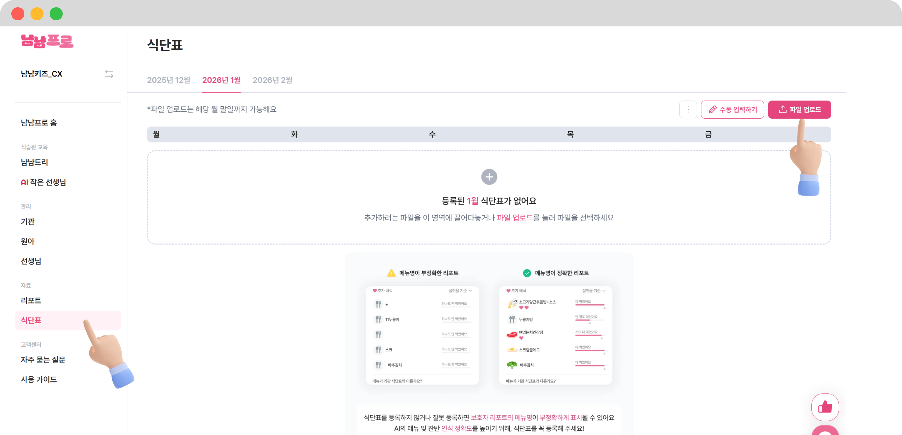 ✅ 이제 냠냠프로(원아, 식단표 등록)를 사용해볼까요?